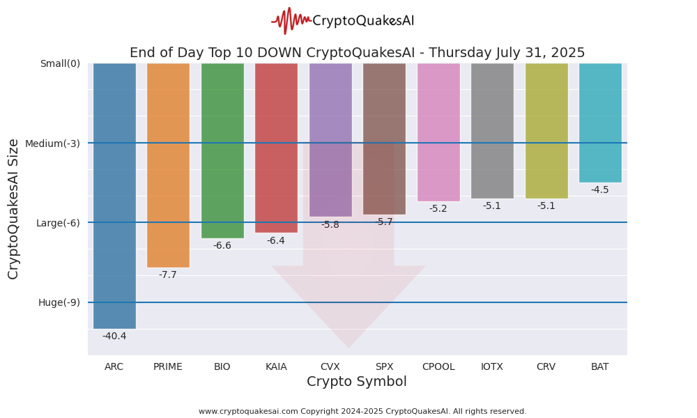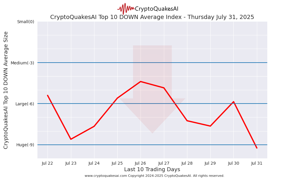 Showing the daily top 10 DOWN crypto symbols and their CryptoQuakesAI values.