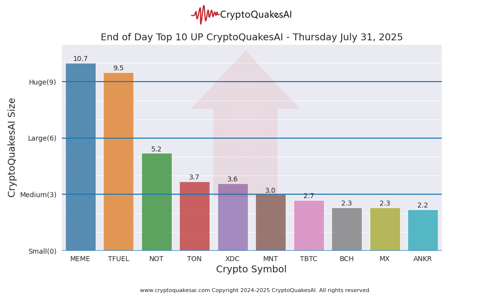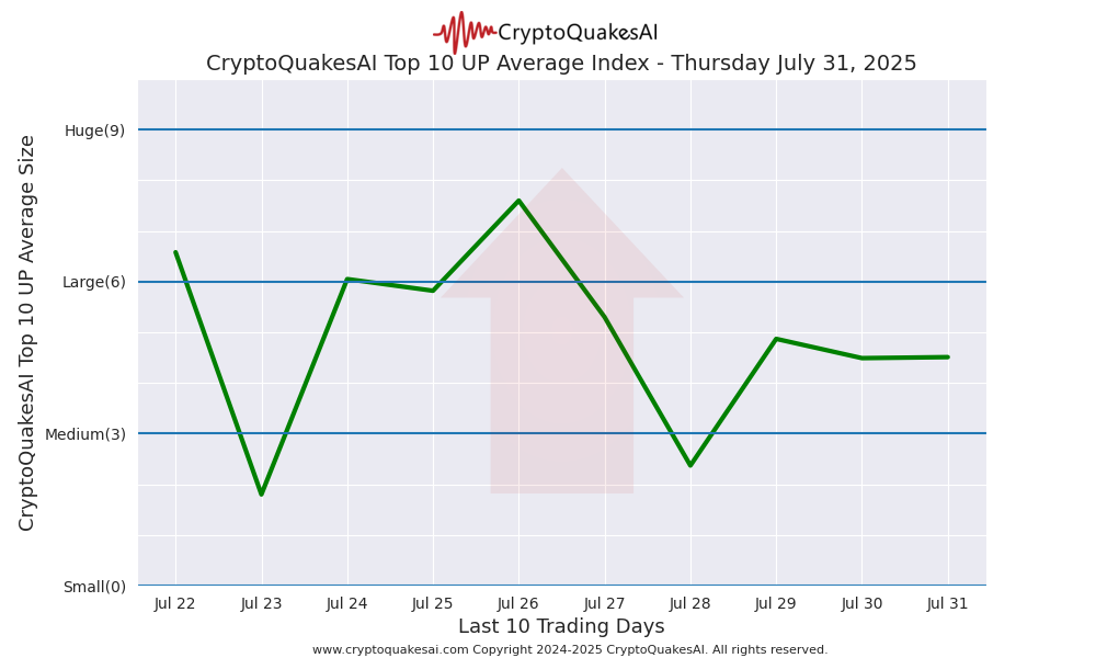 Showing the daily top 10 UP crypto symbols and their CryptoQuakesAI values.